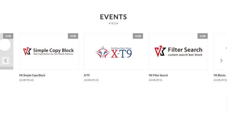 コピペで使える WordPress のブロックパターンライブラリ「投稿リスト_全幅スライダー_左右が見切れている」のパターンです。