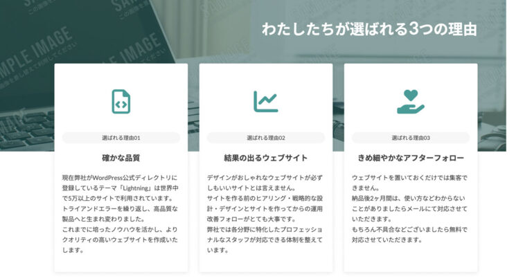 コピペで使える WordPress のブロックパターンライブラリ「わたしたちが選ばれる3つの理由」のパターンです。